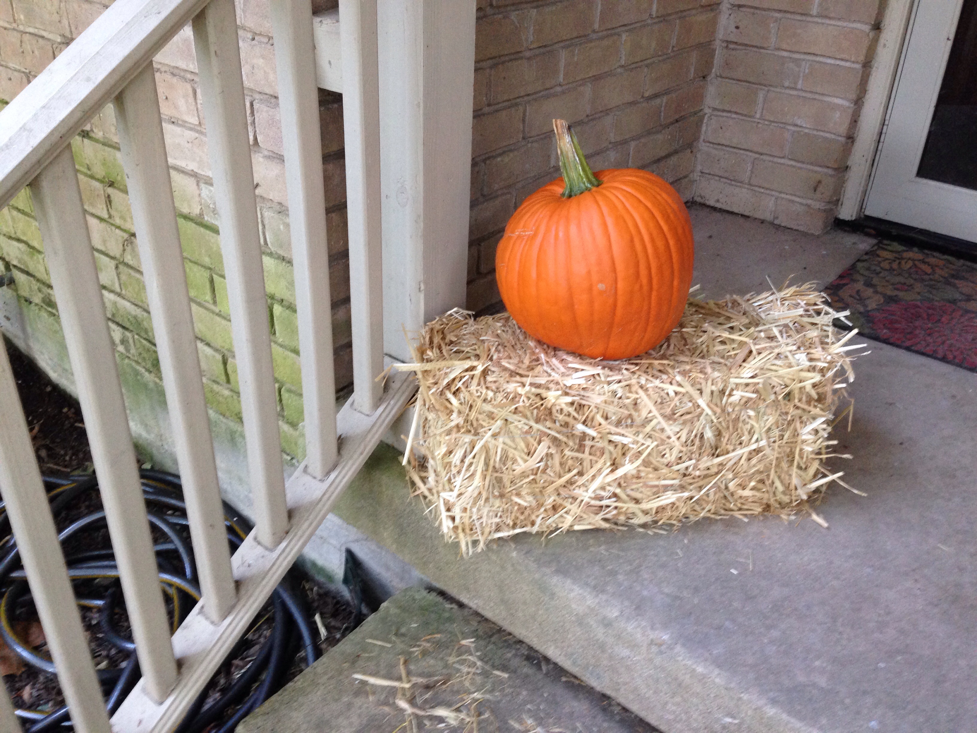 Michaels had these hay blocks on sale, and they looked perfect on our steps with our lone pumpkin! We will be getting more but I think this might be the one we plan to carve.